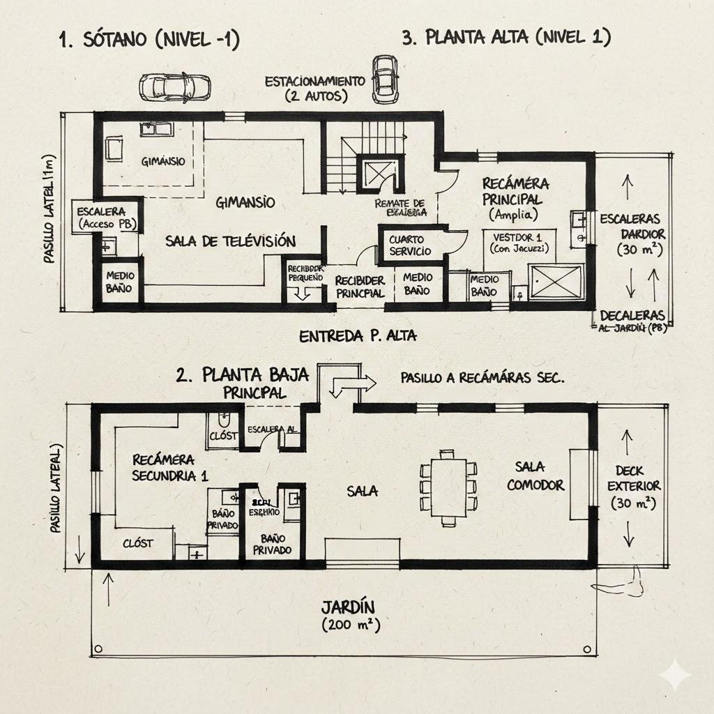Planta baja: Estacionamiento para 2 vehículos, entrada principal con recibidor, cocina integral, medio baño, estancia para sala comedor y acceso al Jardin de 200m2 con deck de reuniones y asador, adicional escalera y Pasillo lateral para acceso de servicio.